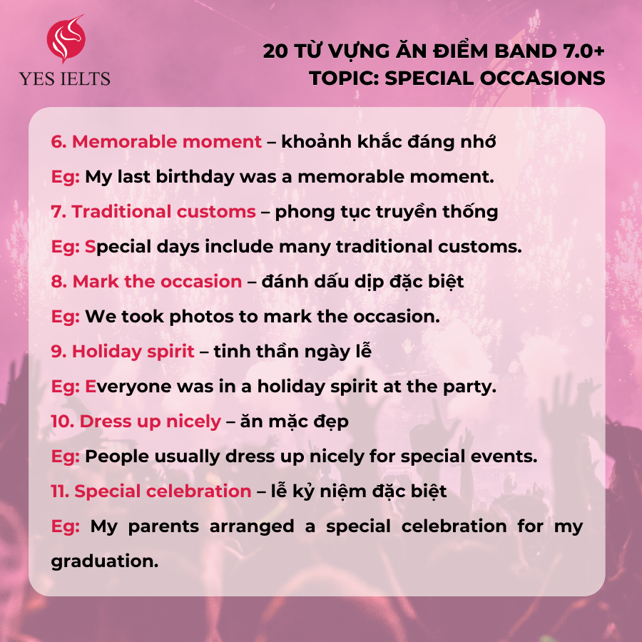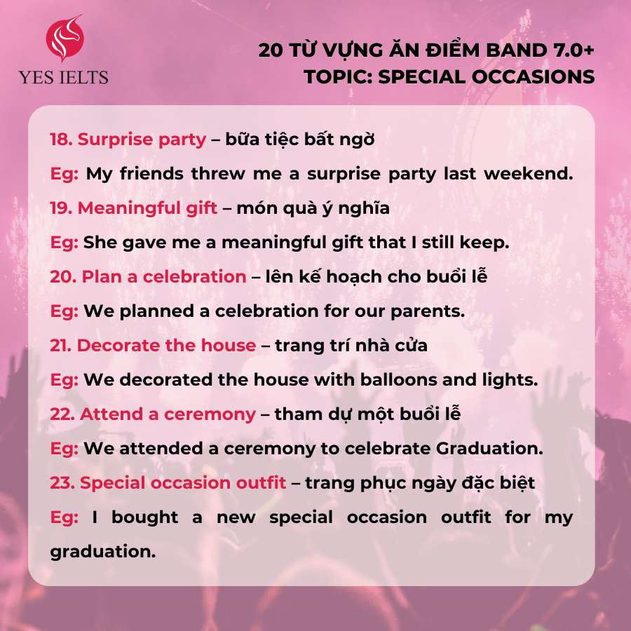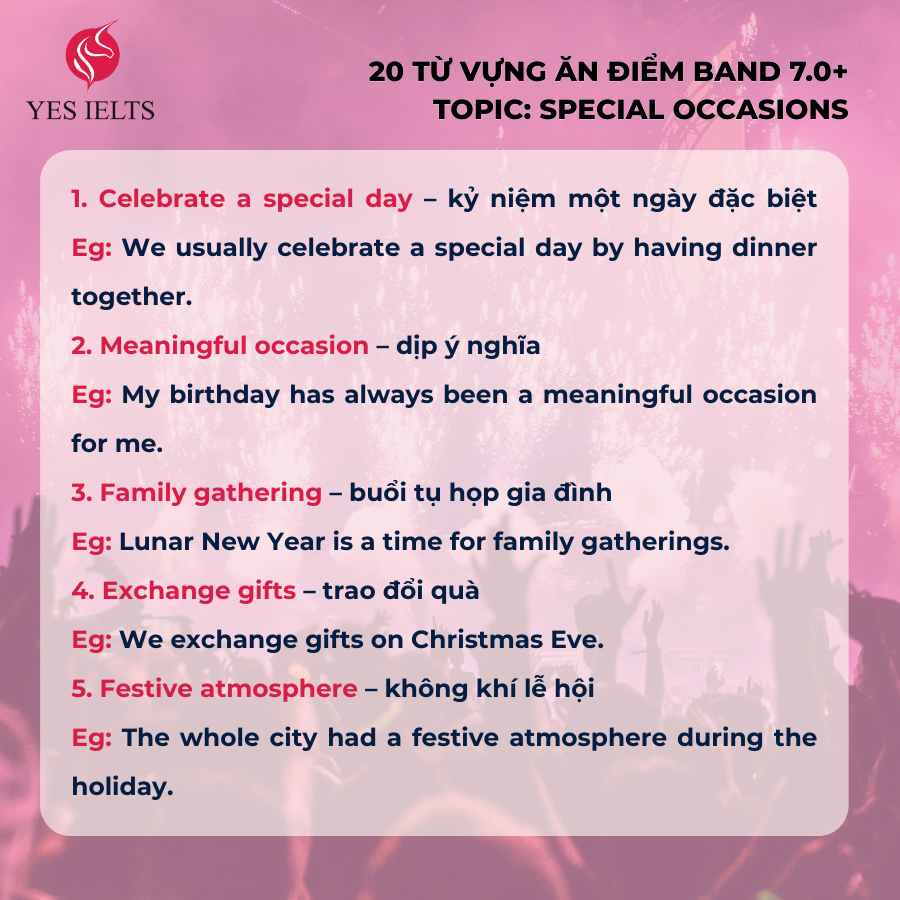 👩🏫 Chủ đề “Special Occasions” nghe tưởng dễ, nhưng mỗi lần vào Speaking hay Writing là các bạn lại xoay quanh “celebrate”, “birthday”, “party”… hoài. Như vậy thì làm sao gây ấn tượng với giám khảo được đúng không nè? 😌
