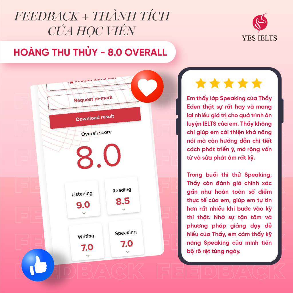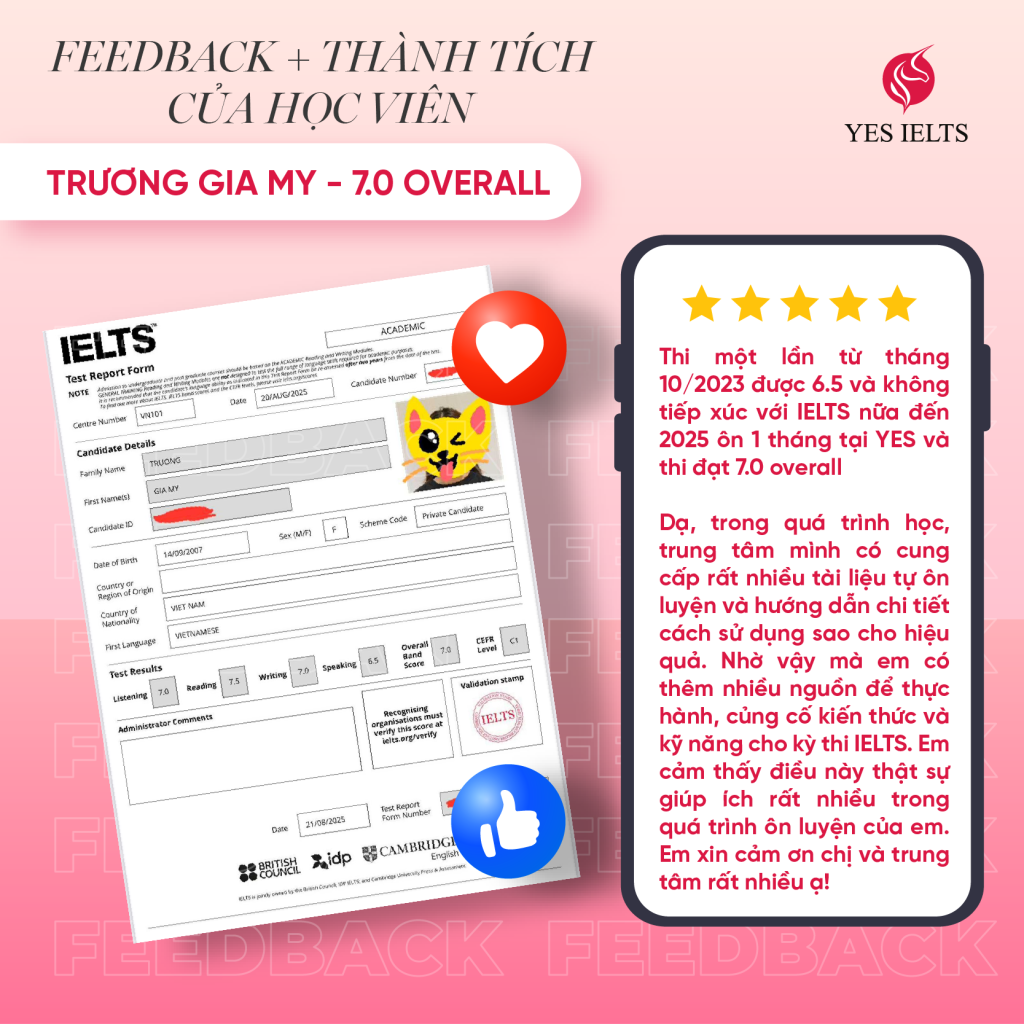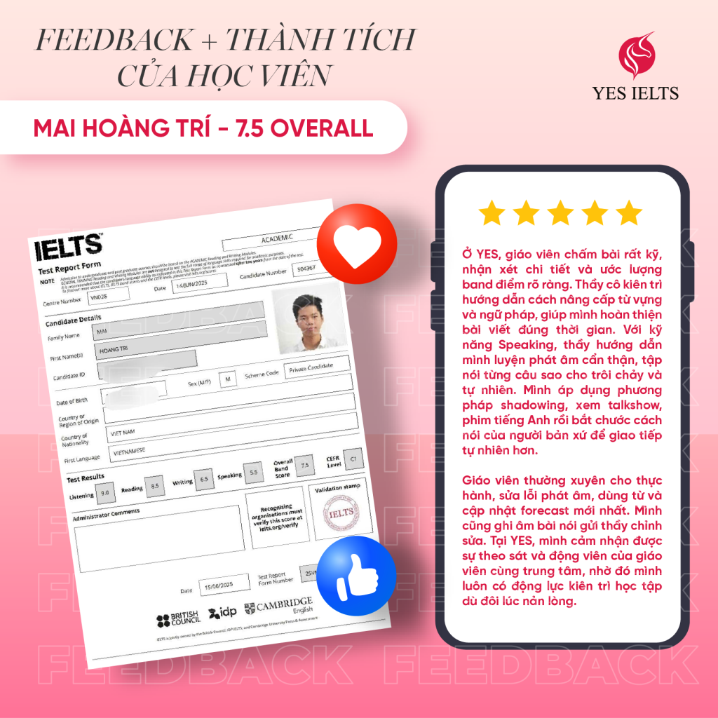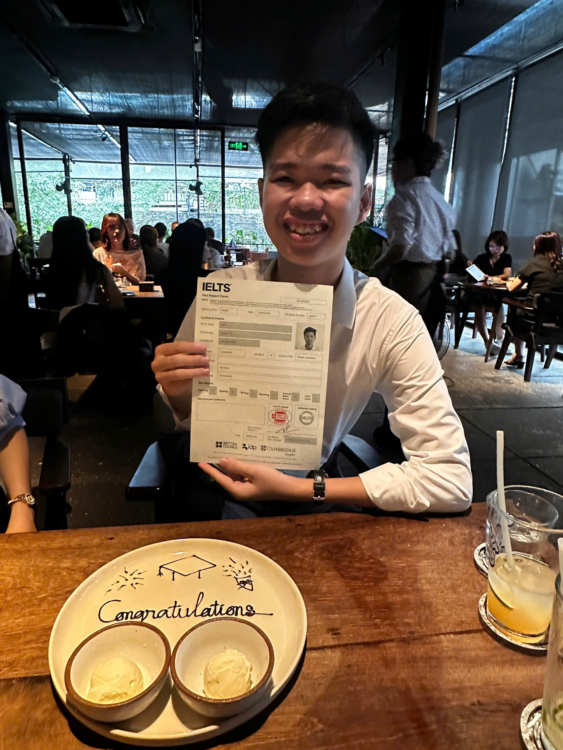 May mắn nhất là mình được thầy Leo ở YES IELTS theo sát quá trình ôn luyện, thầy hướng dẫn từ phát âm, đến tốc độ và từ vựng mới. Vậy nên, việc mình kiên trì ôn luyện chỉ mới là điều kiện cần, còn điều kiện đủ vẫn là có một người đồng hành thực sự hết mình vì mục tiêu của học viên.