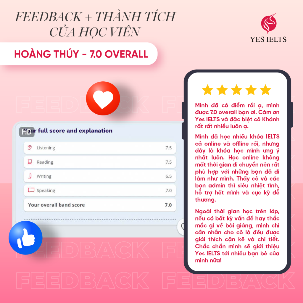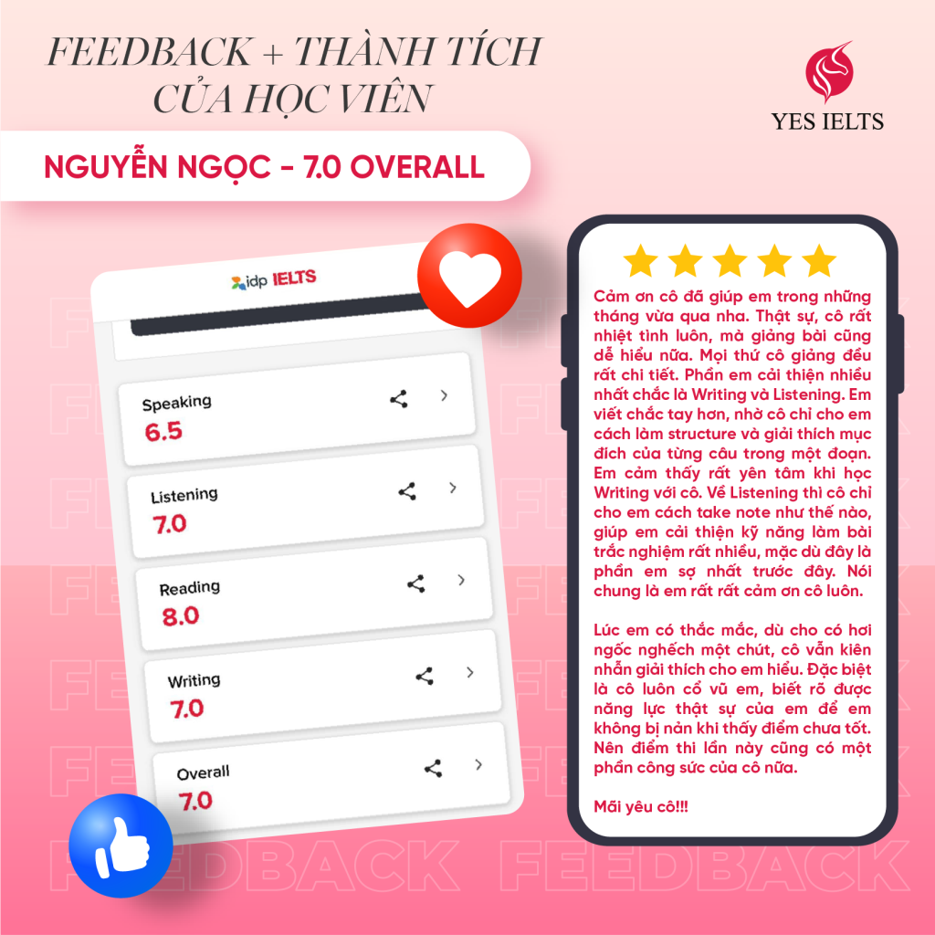 Nói về phần Writing & Speaking thì thú thật là trước đó mình không biết gì về cấu trúc bài thi, nên khi học ở YES, mình xem thật kỹ phần lý thuyết thầy dạy, cũng như các tài liệu mà Trung tâm gửi bổ trợ thêm cho mình. Từ đó, mình biết cách viết và nói sao cho ổn nhất.