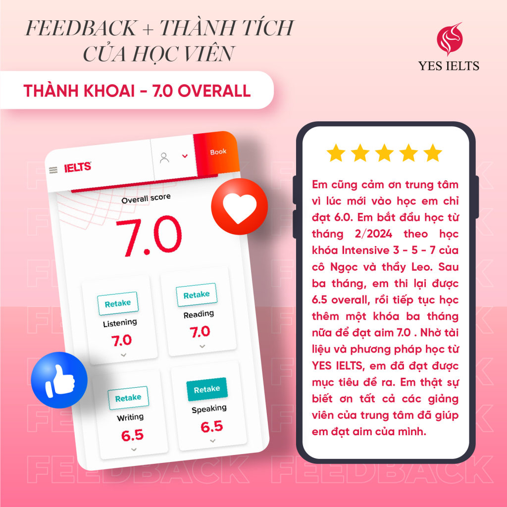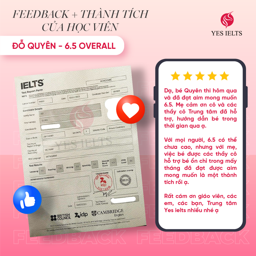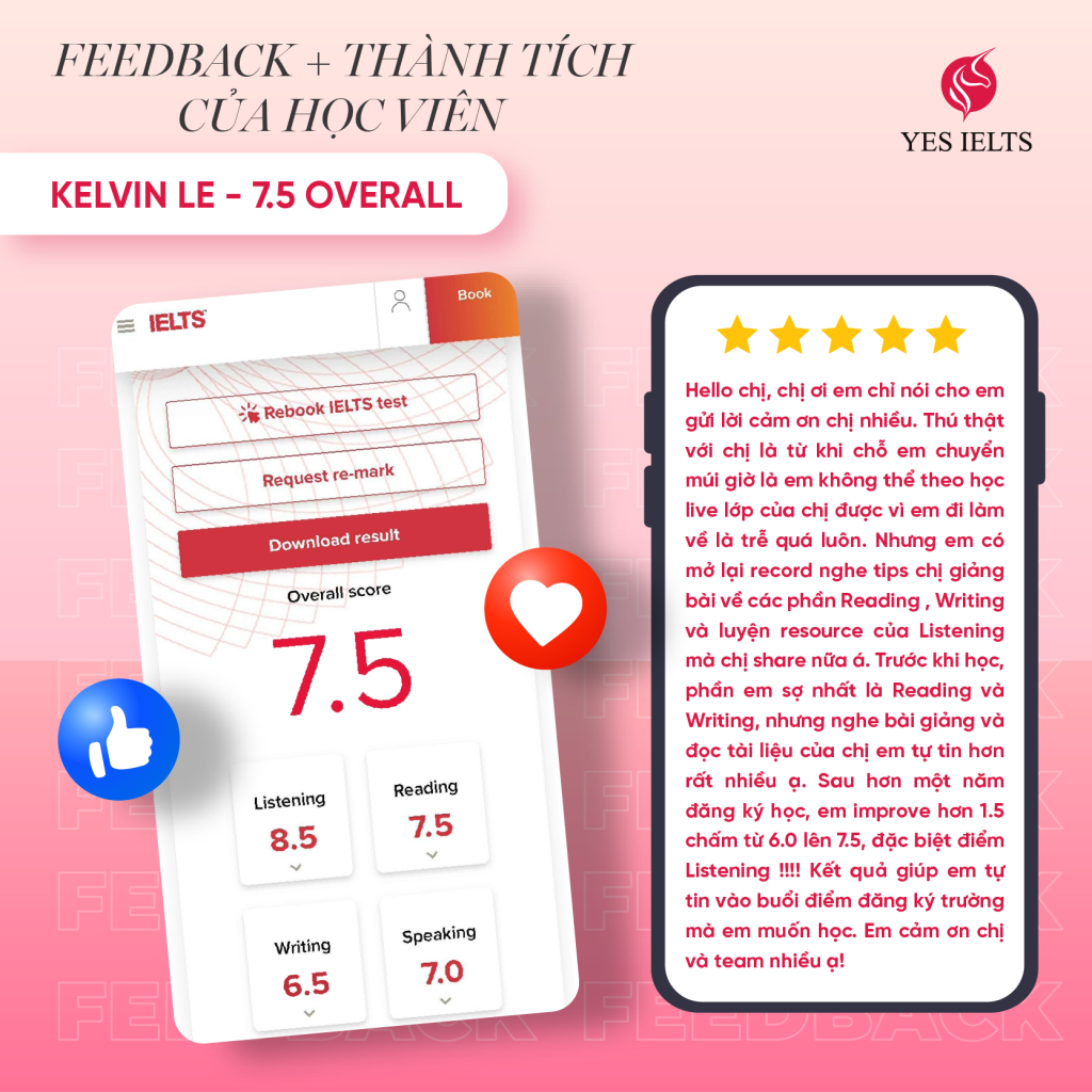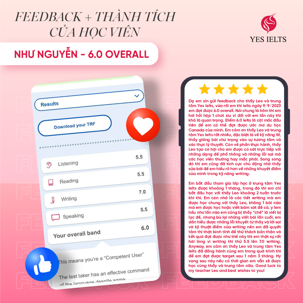 May mắn nhất là mình được thầy Leo ở YES IELTS theo sát quá trình ôn luyện, thầy hướng dẫn từ phát âm, đến tốc độ và từ vựng mới. Vậy nên, việc mình kiên trì ôn luyện chỉ mới là điều kiện cần, còn điều kiện đủ vẫn là có một người đồng hành thực sự hết mình vì mục tiêu của học viên.