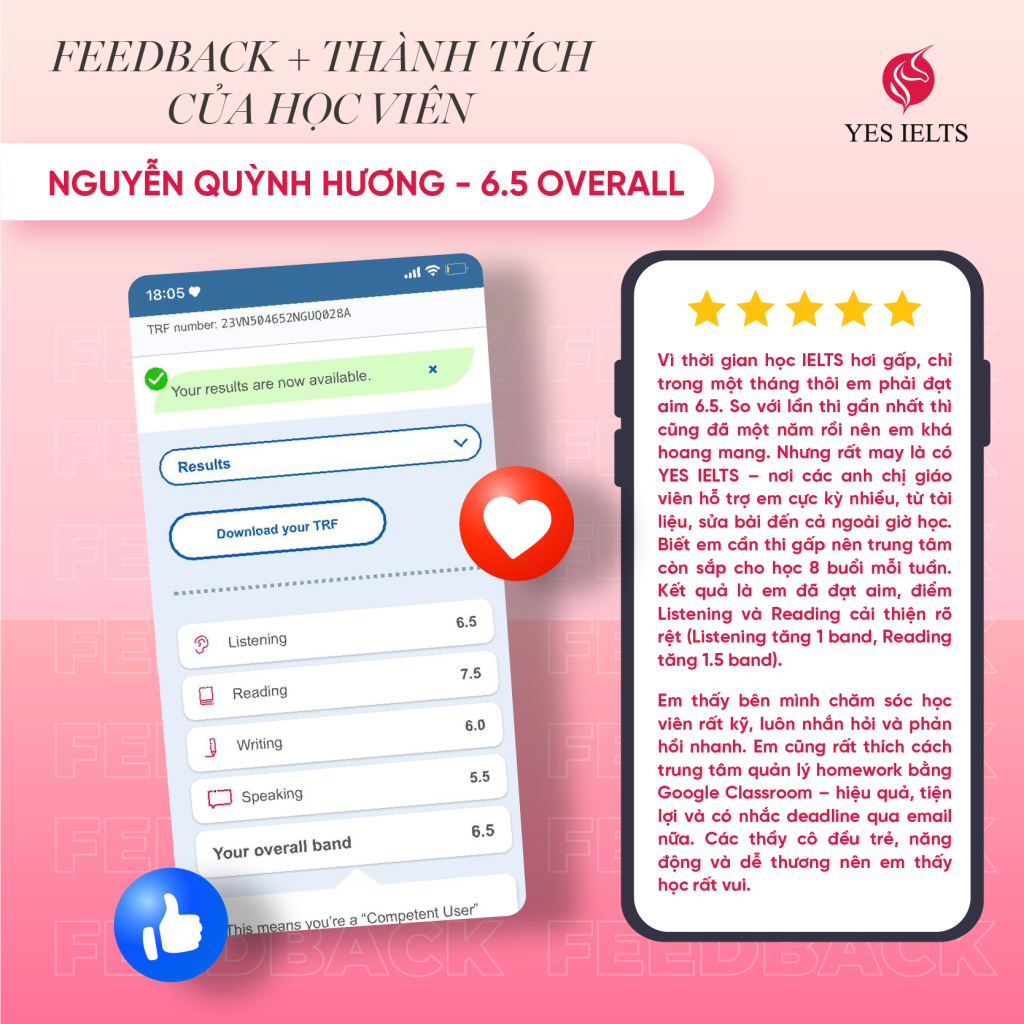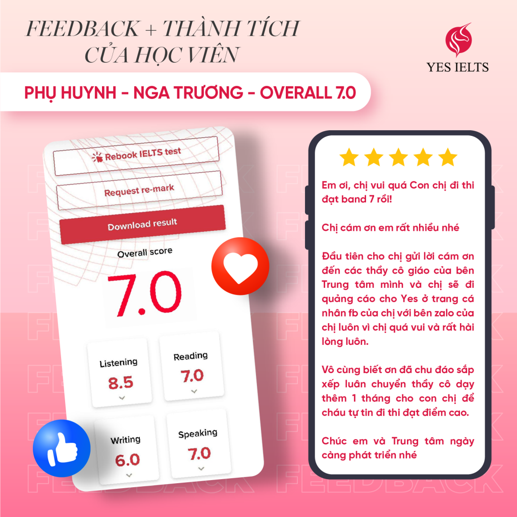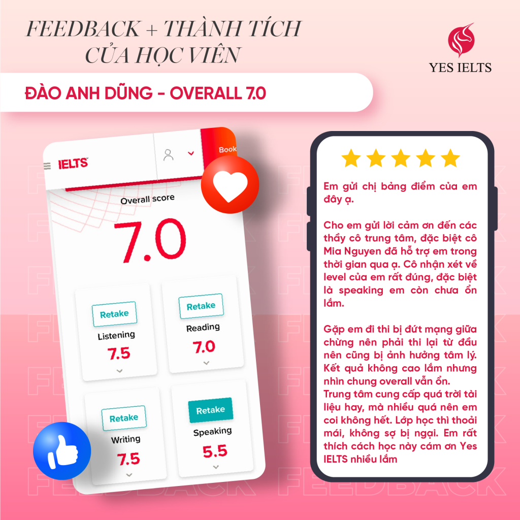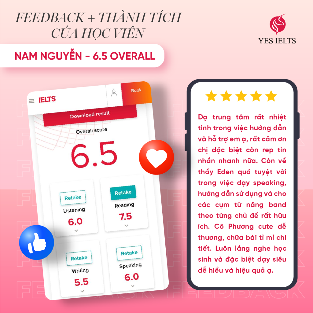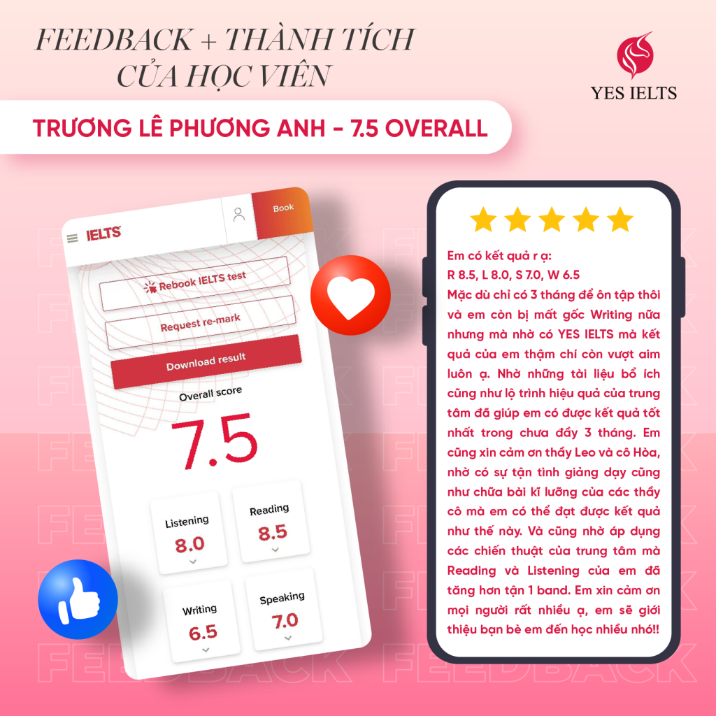May mắn nhất là mình được thầy Leo ở YES IELTS theo sát quá trình ôn luyện, thầy hướng dẫn từ phát âm, đến tốc độ và từ vựng mới. Vậy nên, việc mình kiên trì ôn luyện chỉ mới là điều kiện cần, còn điều kiện đủ vẫn là có một người đồng hành thực sự hết mình vì mục tiêu của học viên.