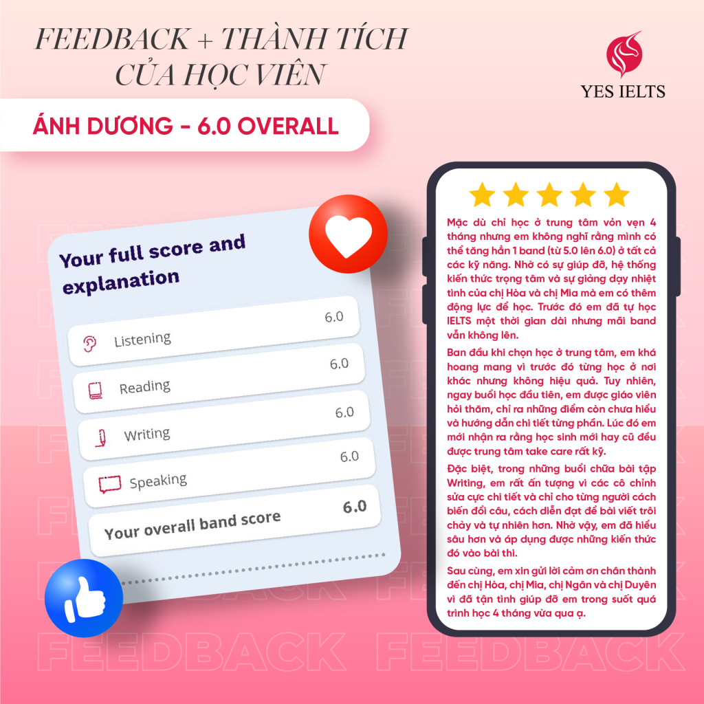 Nói về phần Writing & Speaking thì thú thật là trước đó mình không biết gì về cấu trúc bài thi, nên khi học ở YES, mình xem thật kỹ phần lý thuyết thầy dạy, cũng như các tài liệu mà Trung tâm gửi bổ trợ thêm cho mình. Từ đó, mình biết cách viết và nói sao cho ổn nhất.