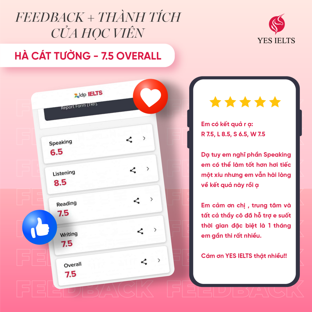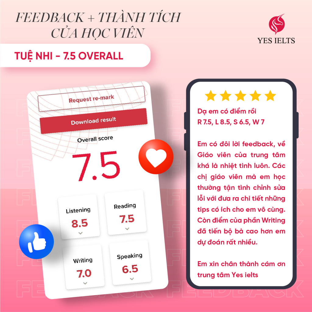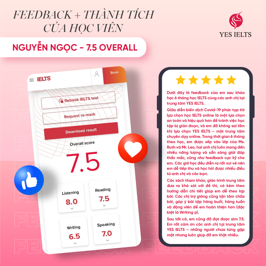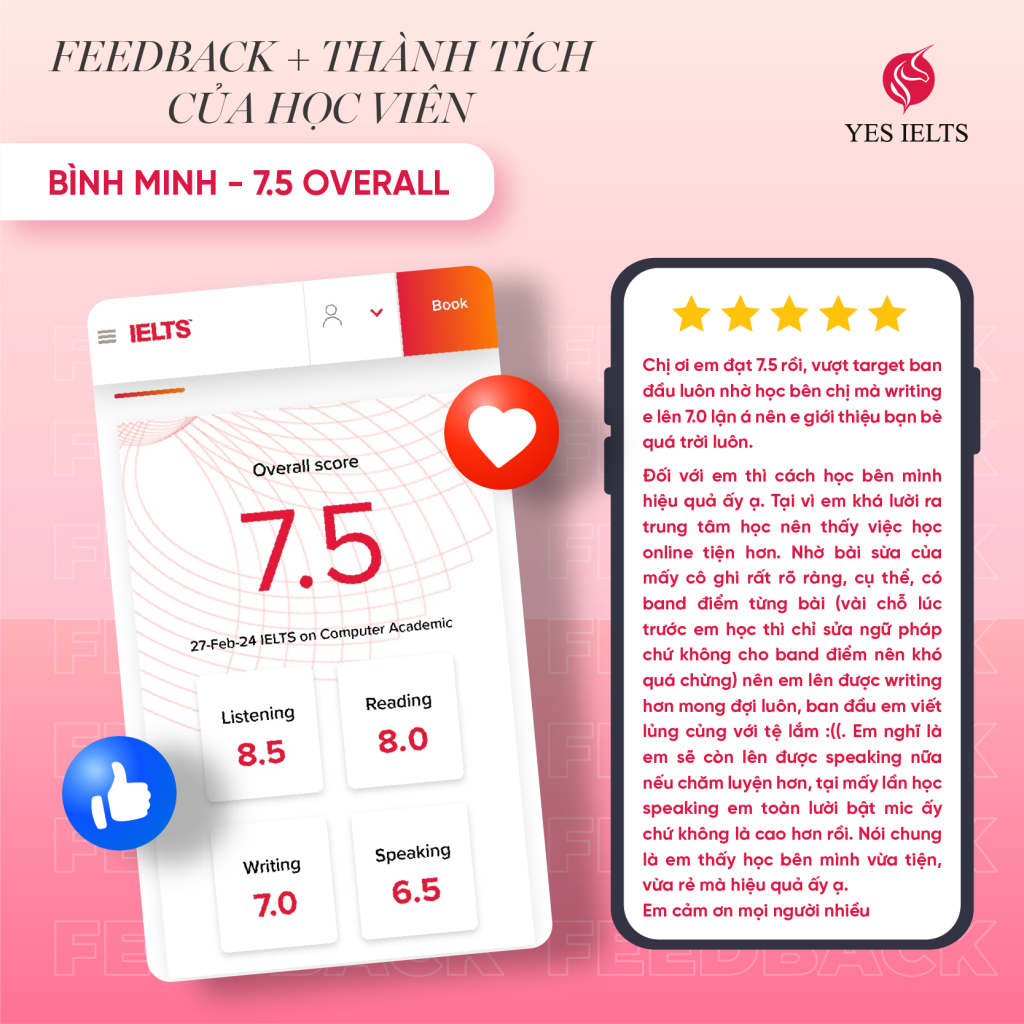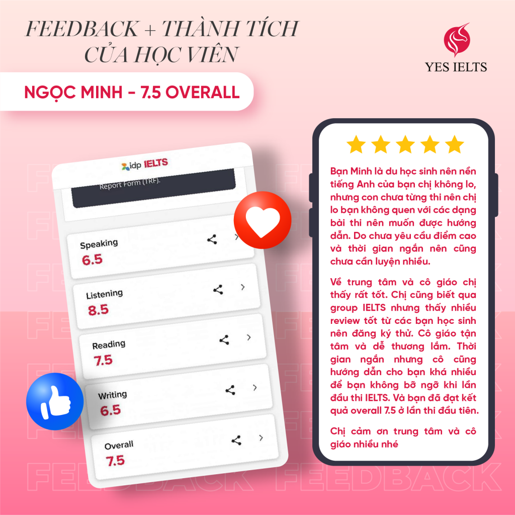 Thực sự là đến giờ mình vẫn còn nguyên cảm xúc vui sướng và tự hào với tin vui vừa nhận được. Bởi đó là kết quả vượt ngoài mong đợi của mình. Mình vừa đạt IELTS 7.5, trong đó Listening 9.0 và Reading 8.5. Ban đầu, mình chỉ dám đặt mục tiêu IELTS 7.0 thôi, nên khi nhận được kết quả này thì mình rất “wow”, rất tự hào, và có thêm động lực cho những kế hoạch tiếp theo.