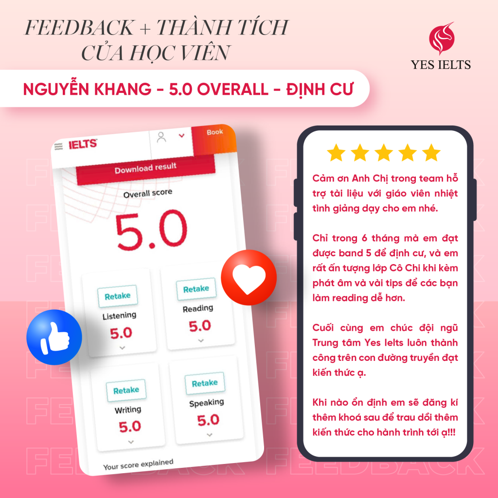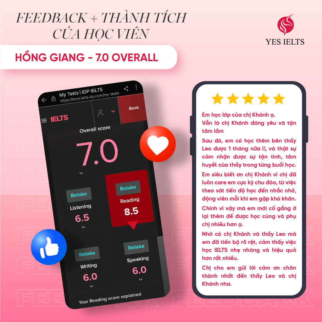 Hôm nay mình xin chia sẻ một chút kinh nghiệm ôn luyện của mình trong 9 tháng vừa qua nha! Mình quyết định chọn YES IELTS để bắt đầu hành trình luyện Ielts qua lời giới thiệu của một người bạn. Tại đây, mình được ôn luyện với thầy Leo, thầy đã hướng dẫn theo một giáo trình được thiết kế riêng, dựa theo năng lực và mục tiêu của cá nhân.