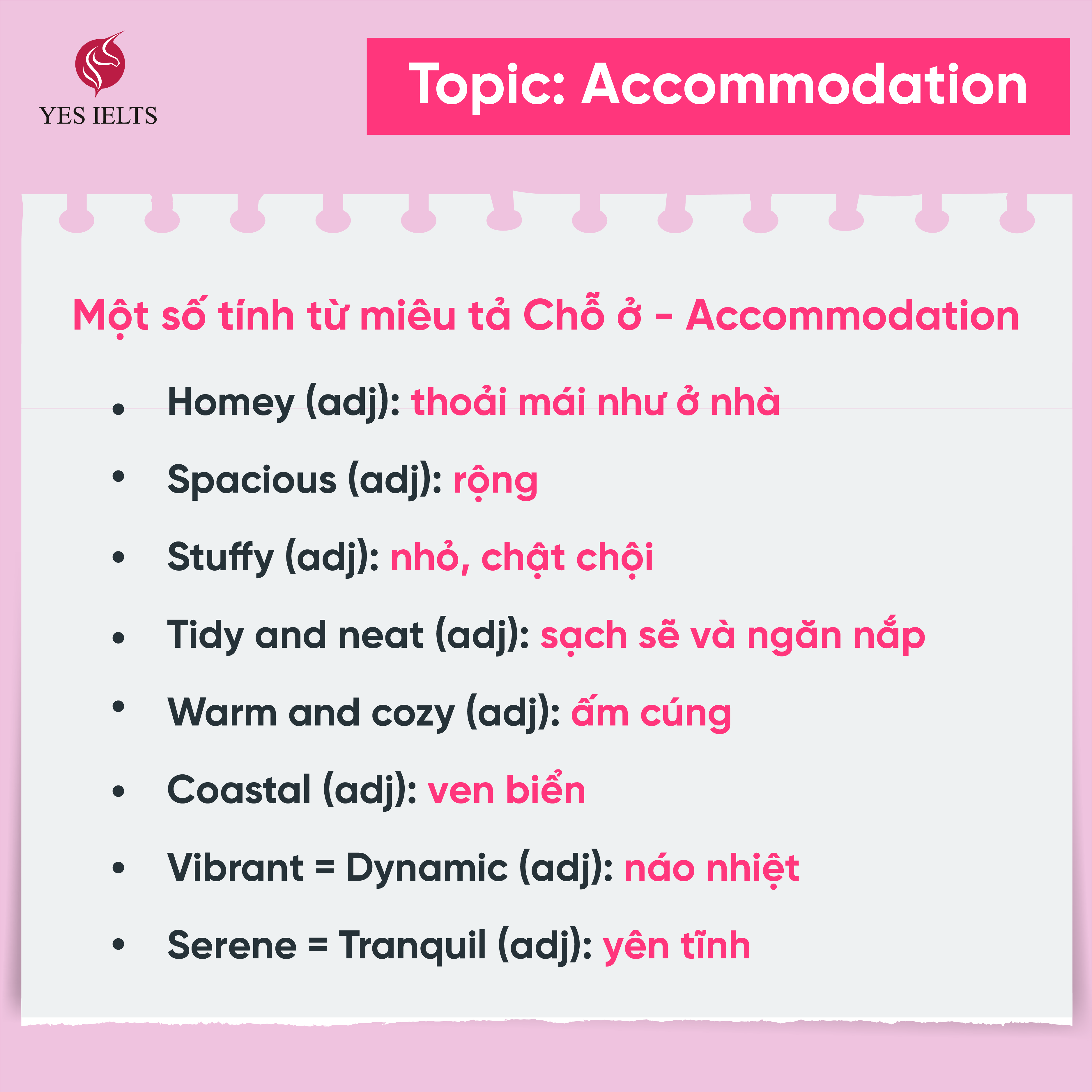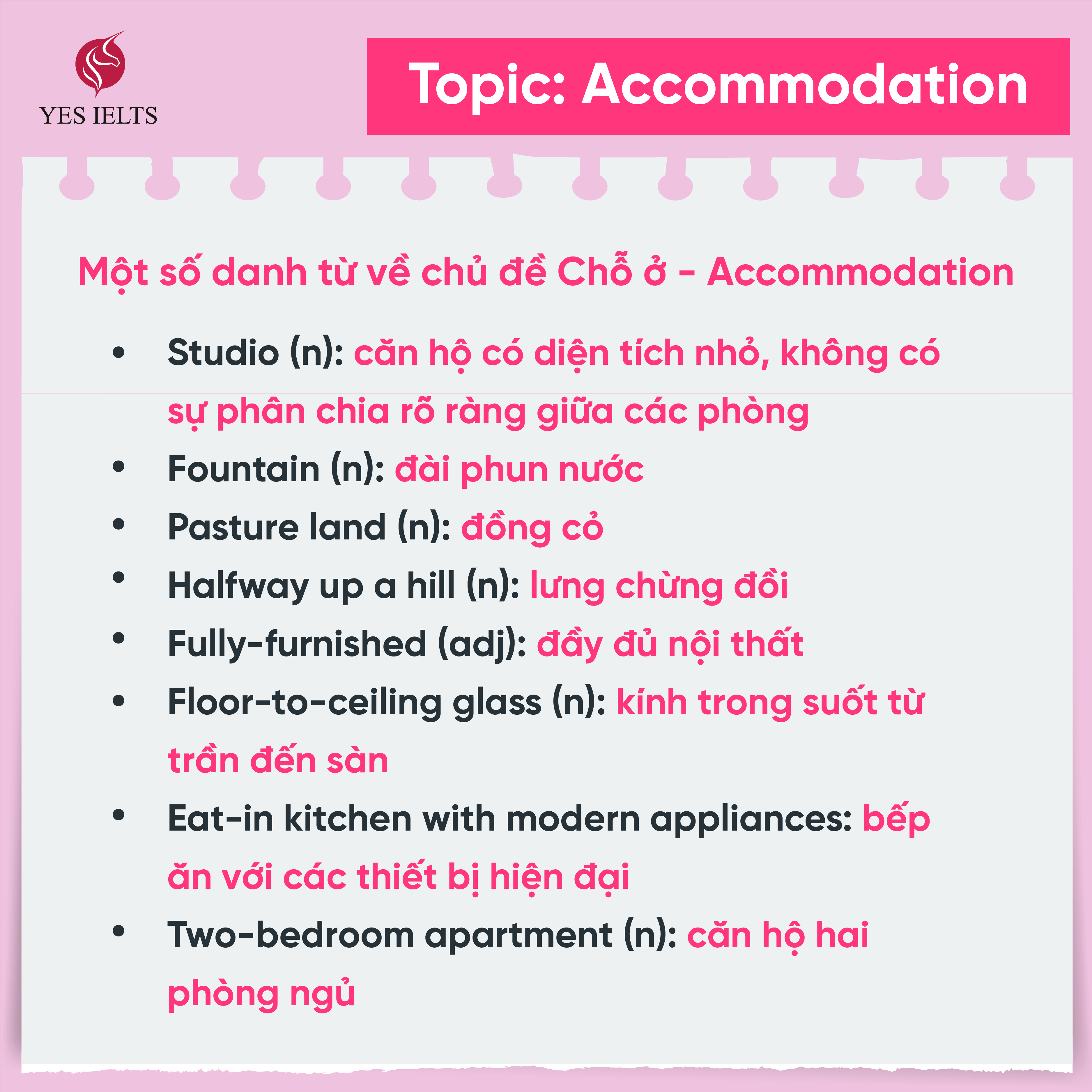 Home/Accommodation (Nơi ở) là một trong số những chủ đề phổ biến nhất trong kỳ thi IELTS Speaking. Chủ đề này xuất hiện với tần suất dày đặc xuyên suốt các kỳ thi IELTS trong các năm gần đây. Vì vậy các sĩ tử nhớ chăm chú học từ vựng của chủ đề này từ mức độ đơn giản đến nâng cao để sẵn sàng chiến đấu trong phòng thi nhé 😍